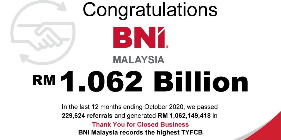 In the last 12 months ending October 2020, BNI members in Malaysia have passed a total of 229,624 referrals and generated RM 1,062,149,518 in Thank You For Closed Business.